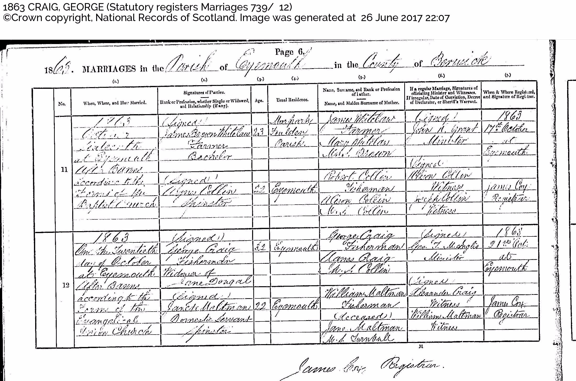marriage george craig janet maltman 1863 eyemouth