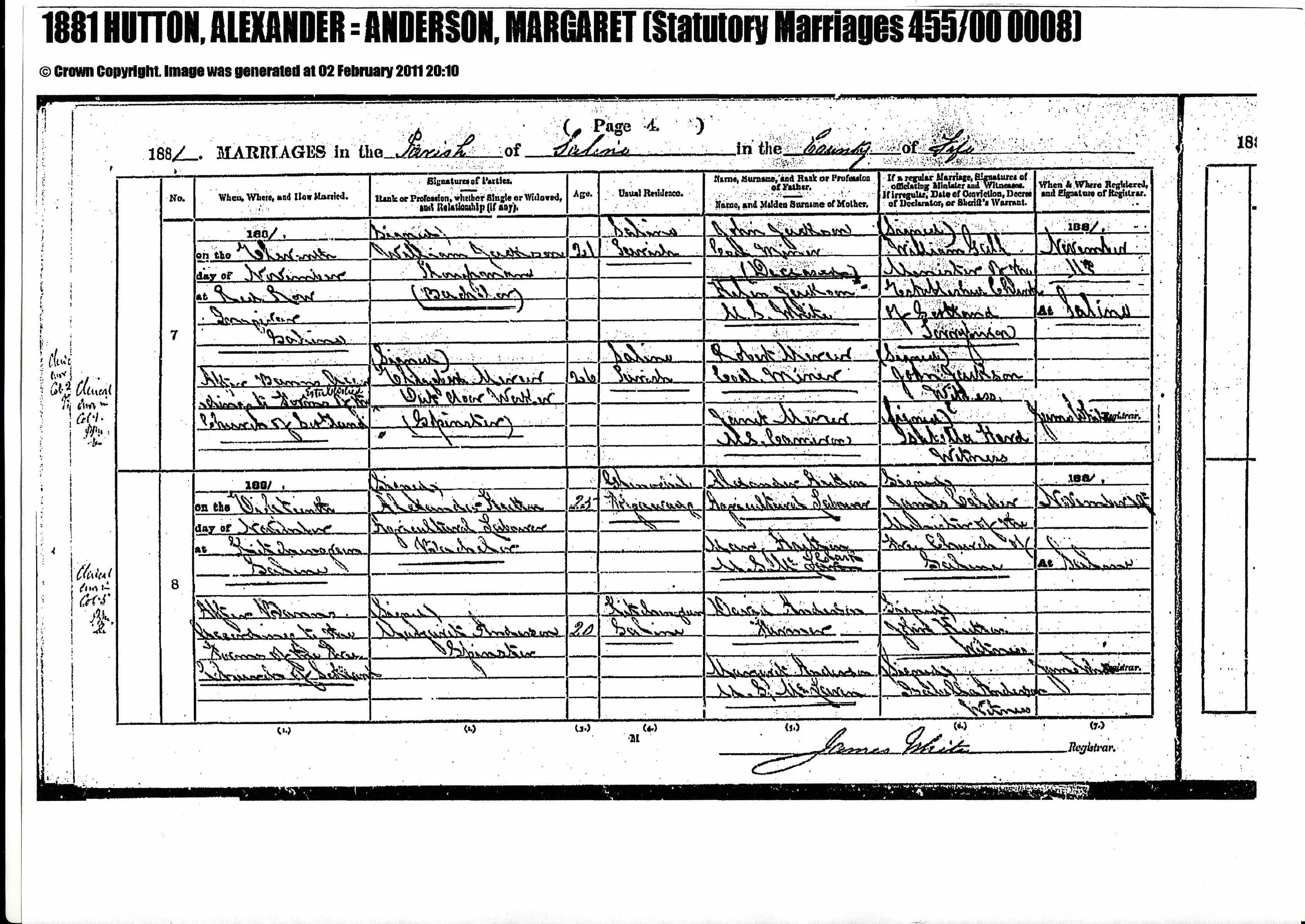 marriage alexander hutton - margaret johnson anderson 1881